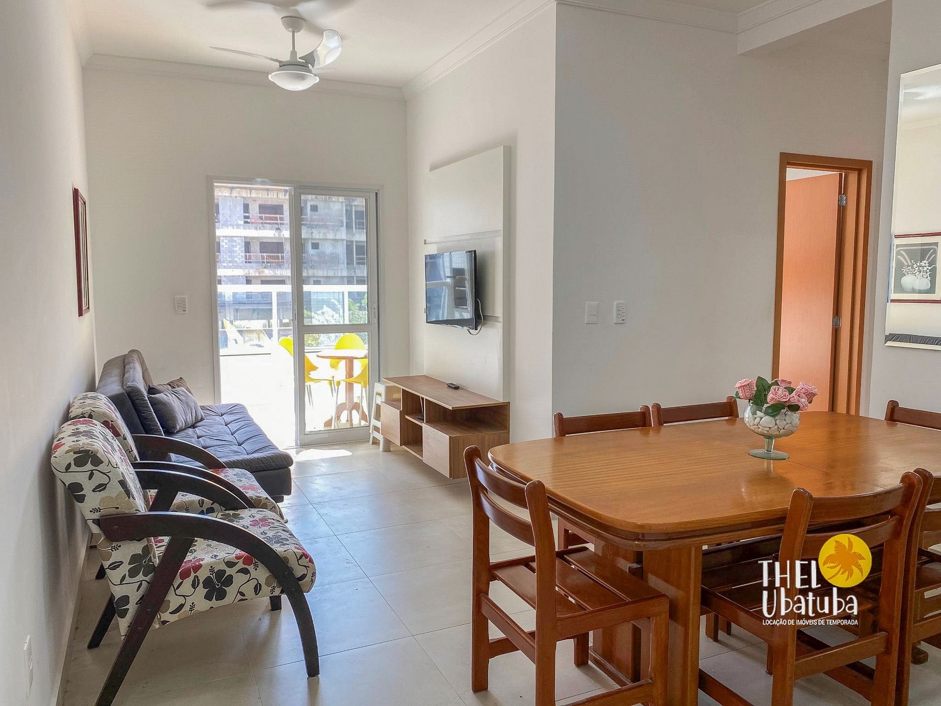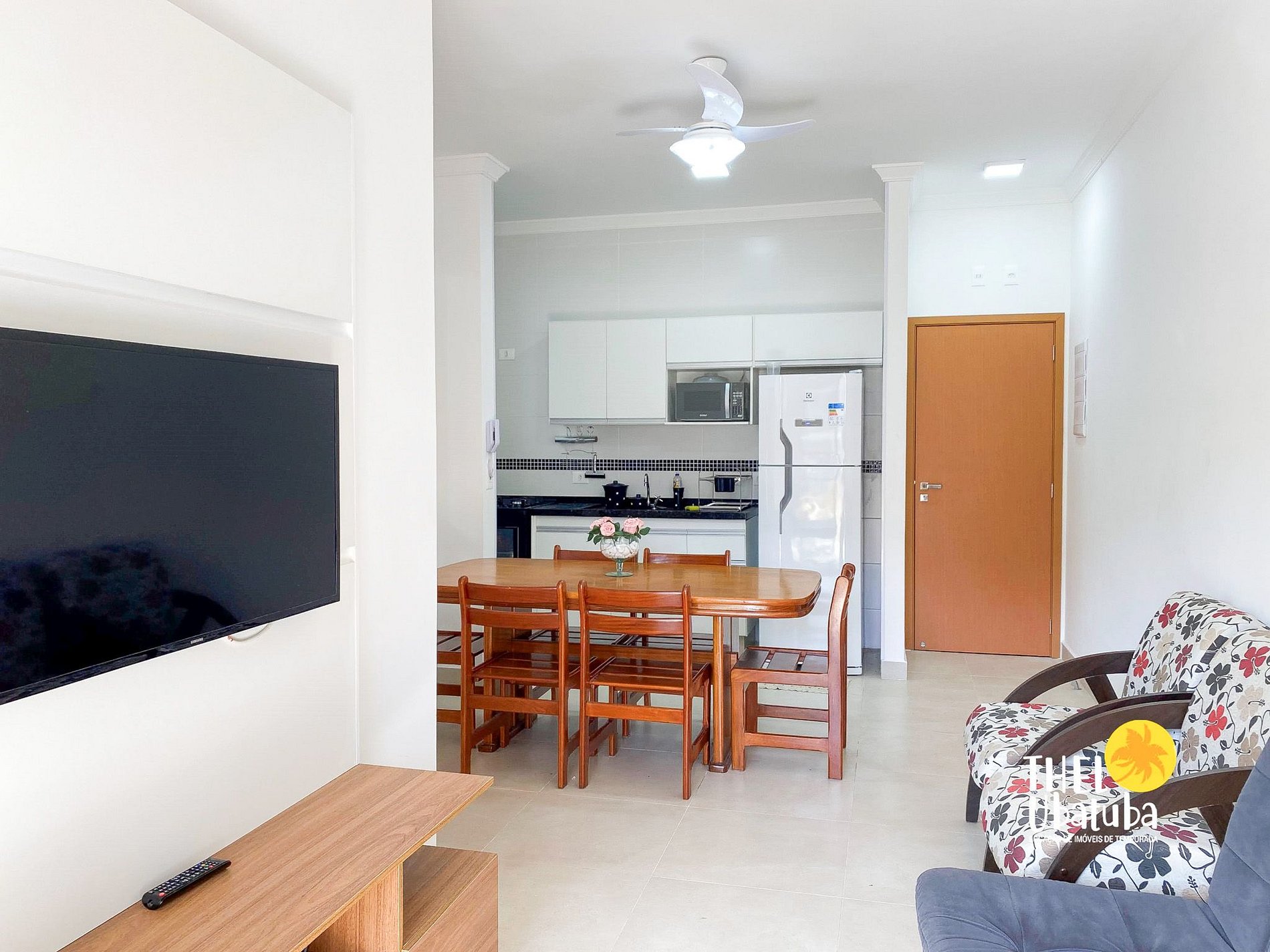 Sala com televisor, ventilador de teto