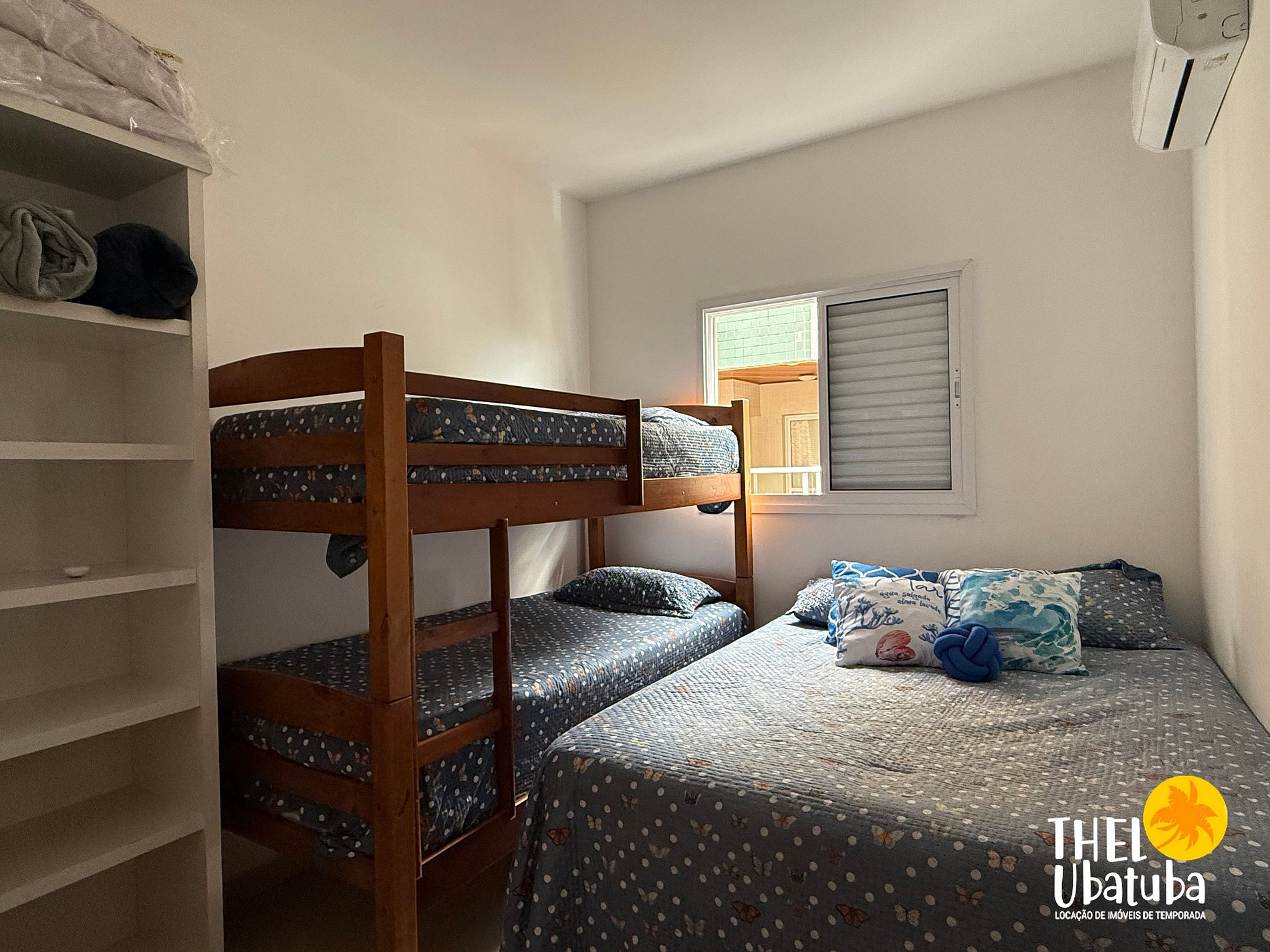 Quarto social: cama casal + beliche (armário com prateleiras e ventilador portátil)